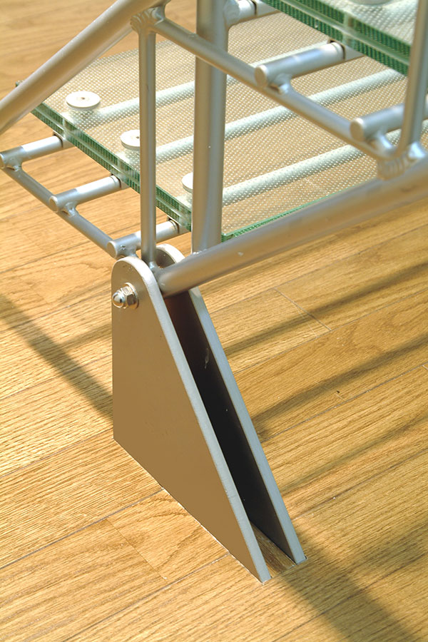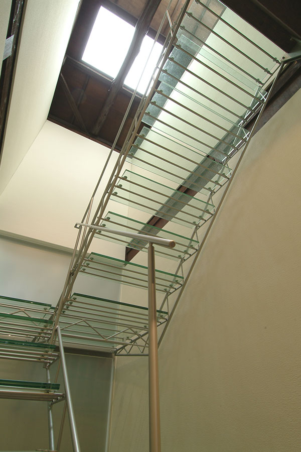 この家にはあらたに位置を変えて玄関ホールの正面にガラスの階段をセットしました。ガラスの階段の上空はトップライトでそこを通した自然光を入れ、階段の下にはその陽光が届く室内プランターを設けました。