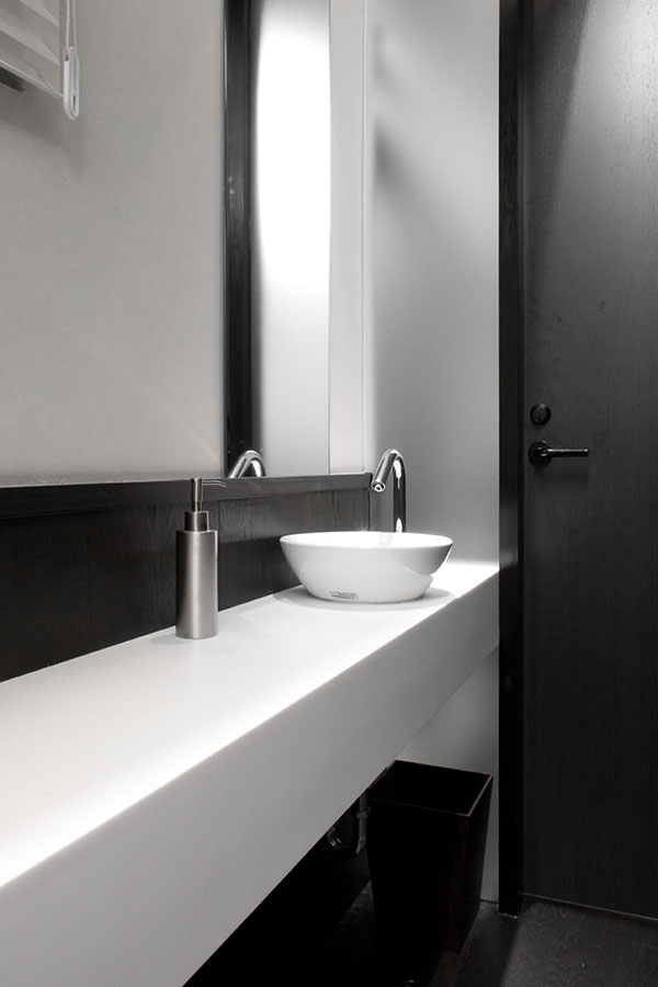 左:上:このクリニックの大きな特徴の一つにこのゆったりとしたトイレ空間があります。トイレの内装は待合室からそのまま連続して繋がる形でダーク系のフローリング床材、同材で構成される腰壁の中に真っ白の衛生陶器を配置しています。二箇所あってそれぞれ男女用に別れて待合室の背面に置かれています。写真はその女性用トイレの室内の様子。