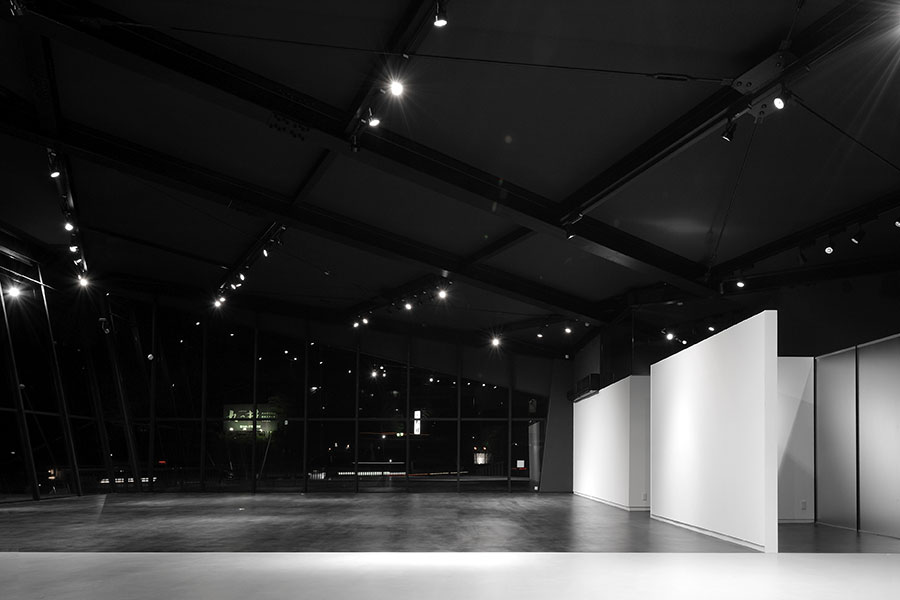 その反対側から見返した様子。切り取られた床面を不連続な壁、ガラス面が取り囲みます。