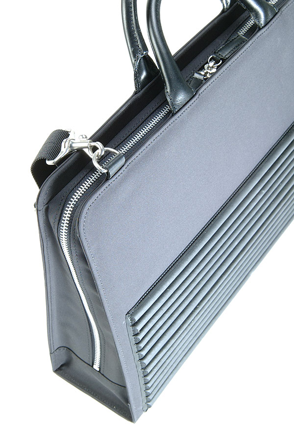 連続するリブは6山で1ユニットを形成し、前後に嵌合させることにより押出しでありながらその直行方向に連続する形態を有します。 バッグ自体はニュートラルなユニセックスの商品を目指しました。「保護性」のみをが唯一のデザイン言語としてそれ以外の機能、装飾を一切持たない「普通の鞄」としての存在感を目指しました。内側にあるべき緩衝材を外側に用いたという新しい提案です。